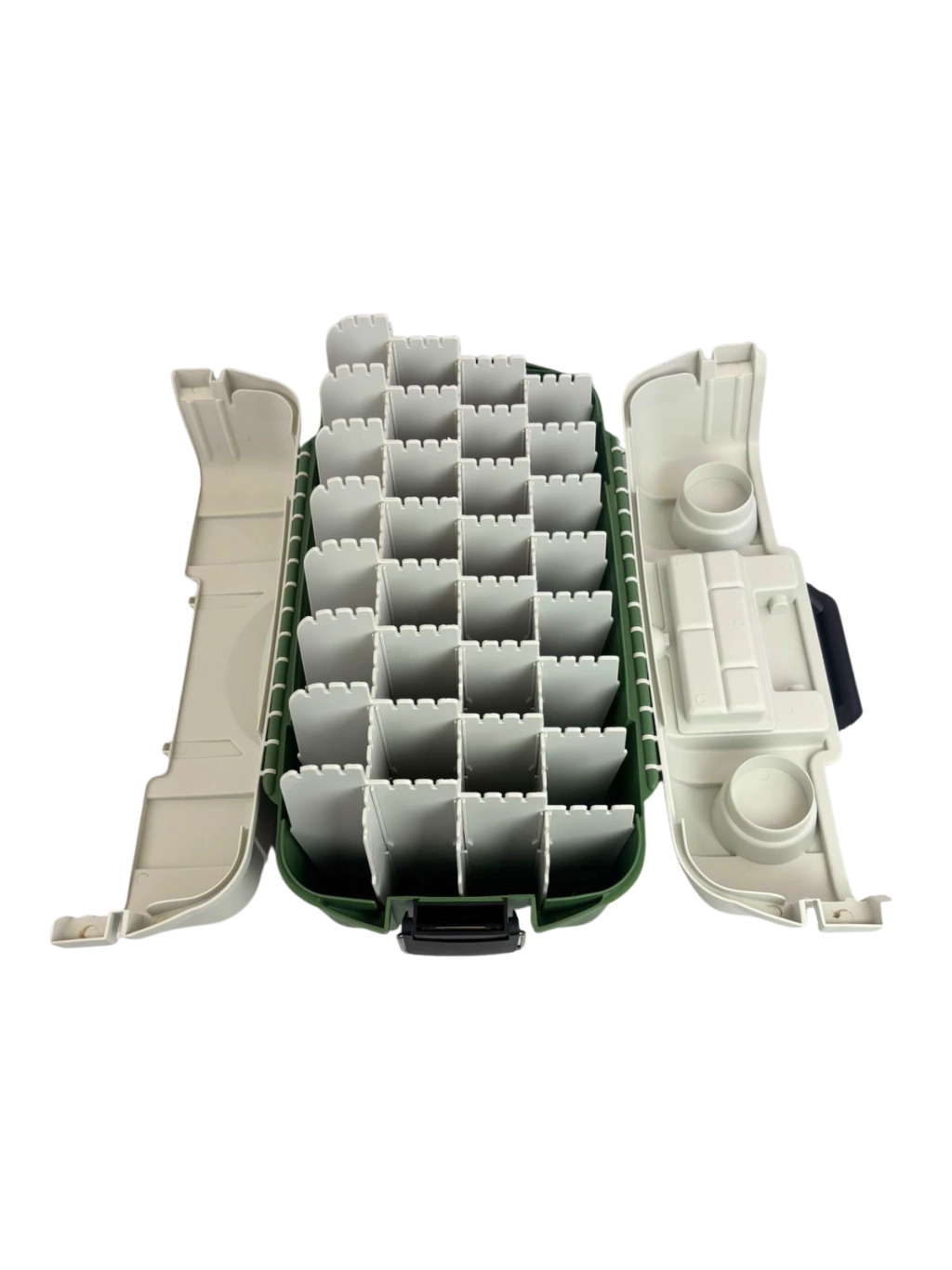 Incluye múltiples separadores internos que se pueden cambiar de lugar o quitar por completo, permitiendo adaptar el espacio para distintos tamaños de señuelos.