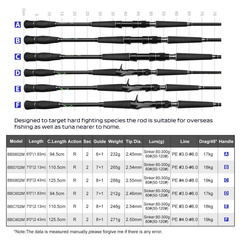 🔹 Modelo BBC602M (1.83 m para reel rotativo) - Tramos: 2 - Pasahilos: 8+1 - Peso: 232 gramos - Diámetro de la punta: 2.50 mm - Cerrada mide: 94.5cm - Freno máximo: 19 kg a 45 grados - Apta para plomos: 80-300 gramos - Portareel: con gatillo - Mango: F
