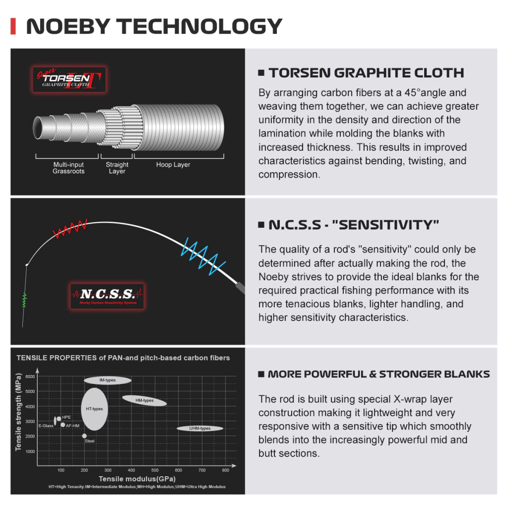 La Caña Noeby Leisure Boat, disponible en 1.86, 2.10 y 2.40 metros, está diseñada para satisfacer las más altas exigencias de los pescadores. Su construcción en grafito TORSEN garantiza una fortaleza estructural excepcional, permitiendo soportar el maltrato que una vara puede sufrir en las condiciones más adversas.