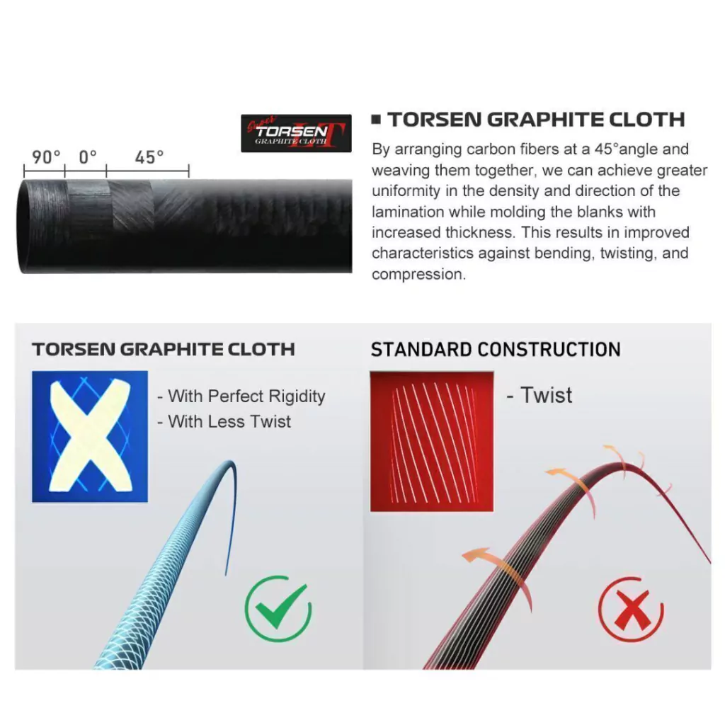 ✔ Torsen Graphite Cloth: Fibras de carbono dispuestas en ángulo de 45° para mayor rigidez, minimizando torsión y deformaciones.