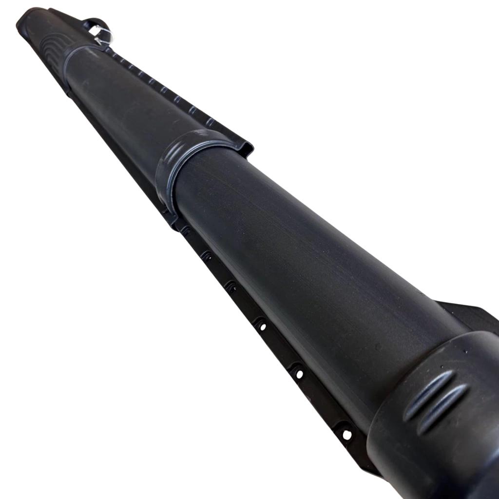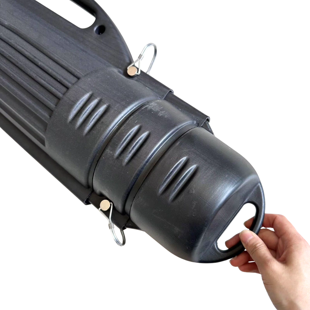 El modelo Amberjack A012-1 es un tubo porta cañas extensible y regulable, ideal para trasladar cañas de baitcast, spinning y lance de manera segura y sin ocupar espacio innecesario.